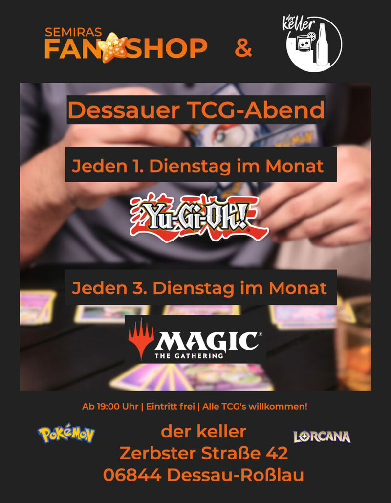 Jeweils am ersten und am dritten Dienstag im Monat findet im keller ein Trading Card Games Abend statt. Während am ersten Dienstag der Fokus etwas mehr auf Yu-Gi-Oh! liegt und am dritten Dienstag etwas mehr auf Magic, sind dennoch jederzeit alle Spielenden mit allen Karten willkommen.